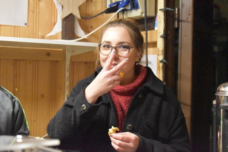 Unser Verkauf war ein voller Erfolg. Die Jugendlichen halfen tatkräftig beim Waffeln machen und belegen, sowie beim Ausschenken des Kinderpunsches und Herausgeben der süßen Köstlichkeiten. Gleichzeitig machten sich zwei Bewohnerinnen zu Fuß auf den Weg in die Menge der Besucher*innen, die das Ambiente und die Stimmung des Marktes genossen, um die selbstgemachten Plätzchen anzubieten. Während dessen waren die pädagogischen Mitarbeiter*innen und FSJler*innen an der Kasse, am Glühweinverkauf und mit dem Gesamtmanagement beschäftigt.